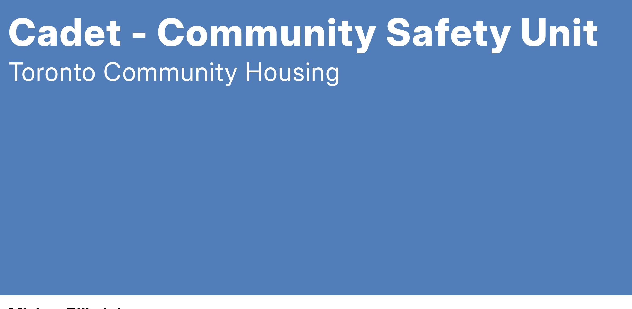 Reporting to the Community Safety Unit Field Supervisor, Cadets will participate in an apprenticeship-style program to gain insight and experience in community engagement and law enforcement. Cadets will acquire practical knowledge, skills and experience working with a diverse population and enrich their experience in diversity and cultural sensitivity. The Cadets will build leadership skills, set and achieve goals, and develop customer service skills. They will have the opportunity to build strong relationships with TCHC staff and other stakeholders and have hands-on experience working for a social housing provider. Cadets will learn about working in a healthy, diverse and respectable environment. All successful Cadets will participate in a five-week formalized training course and programs in-class and on-hands.