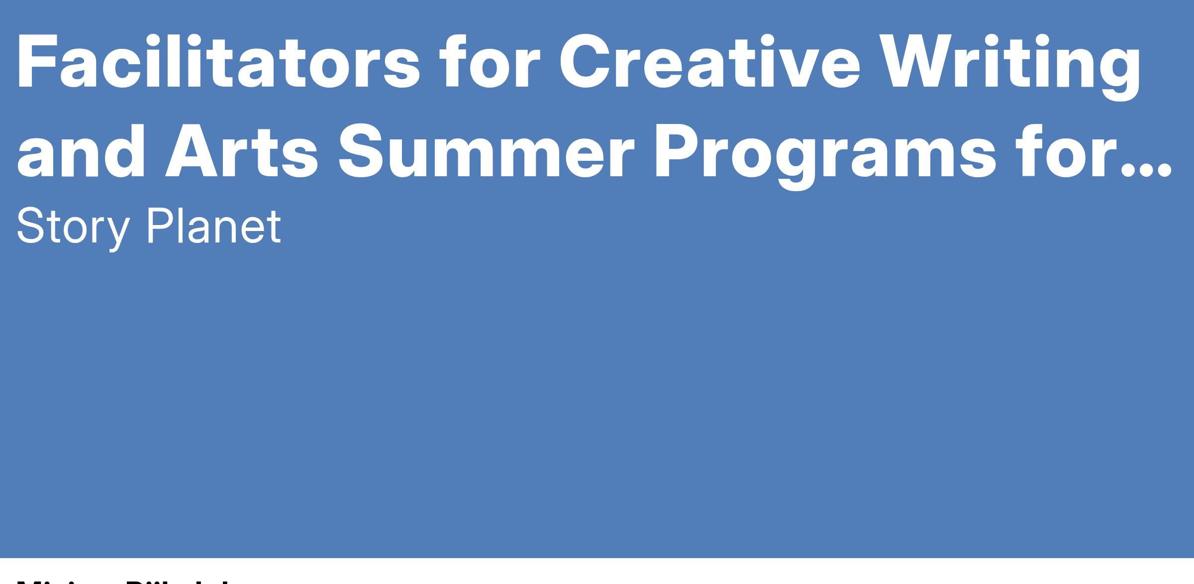 Story Planet is hiring three full-time summer program facilitators for our creative writing and arts summer programs. This is an exciting opportunity to make meaningful contributions to program design and planning while gaining experience working with children in a creative setting.