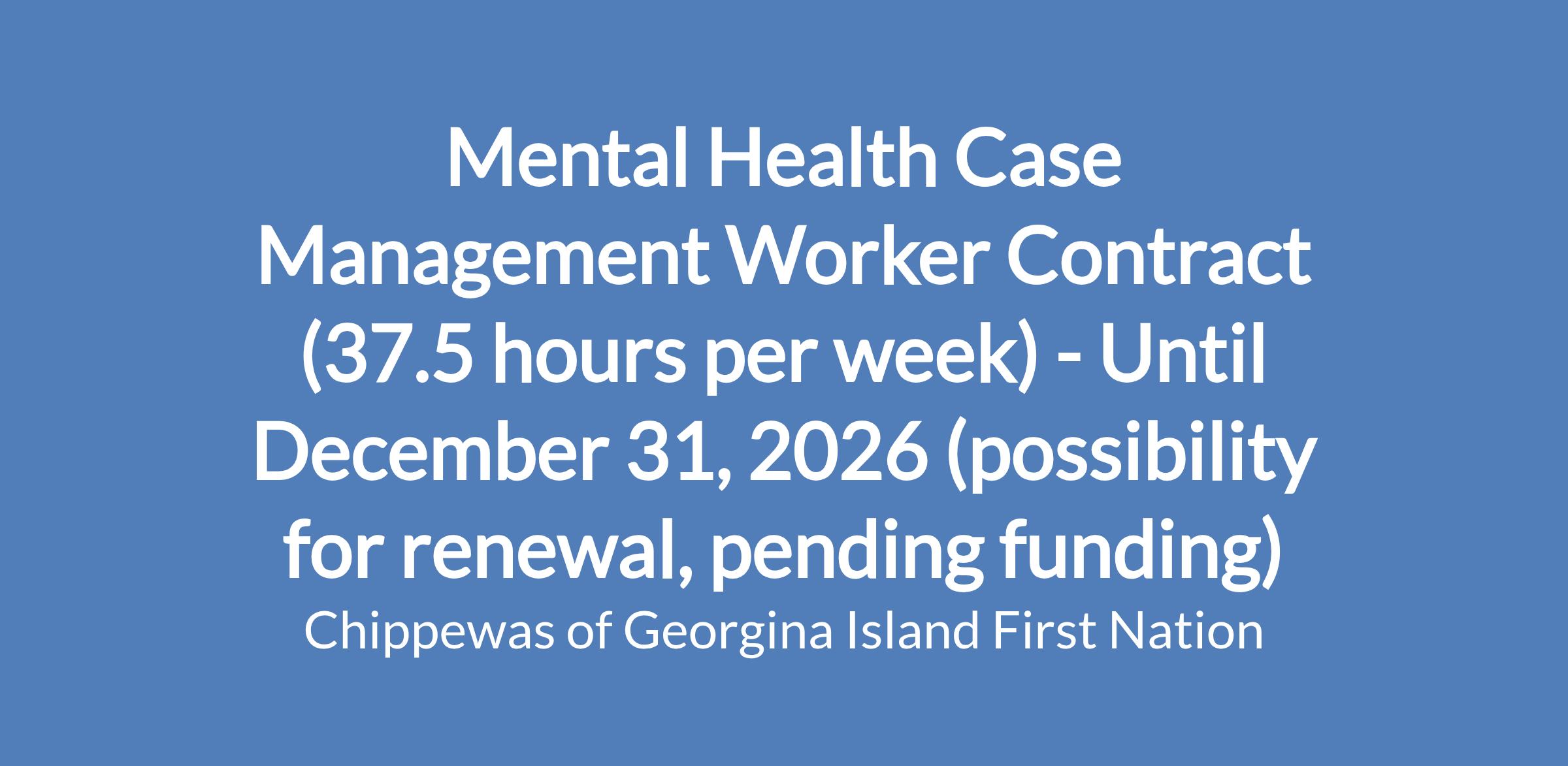 The Mental Health Case Management Worker will be part of a multidisciplinary team that provides culturally grounded, holistic mental health support to community members of the Chippewas of Georgina Island First Nation. This role focuses on helping clients access the mental health care, assessments, and resources they need; while ensuring they receive coordinated, compassionate, and culturally safe support with healing and wellness rooted in Anishinaabe values, teachings and cultural practices. Services focus on client and family centred mental health with an emphasis on prevention and early intervention.