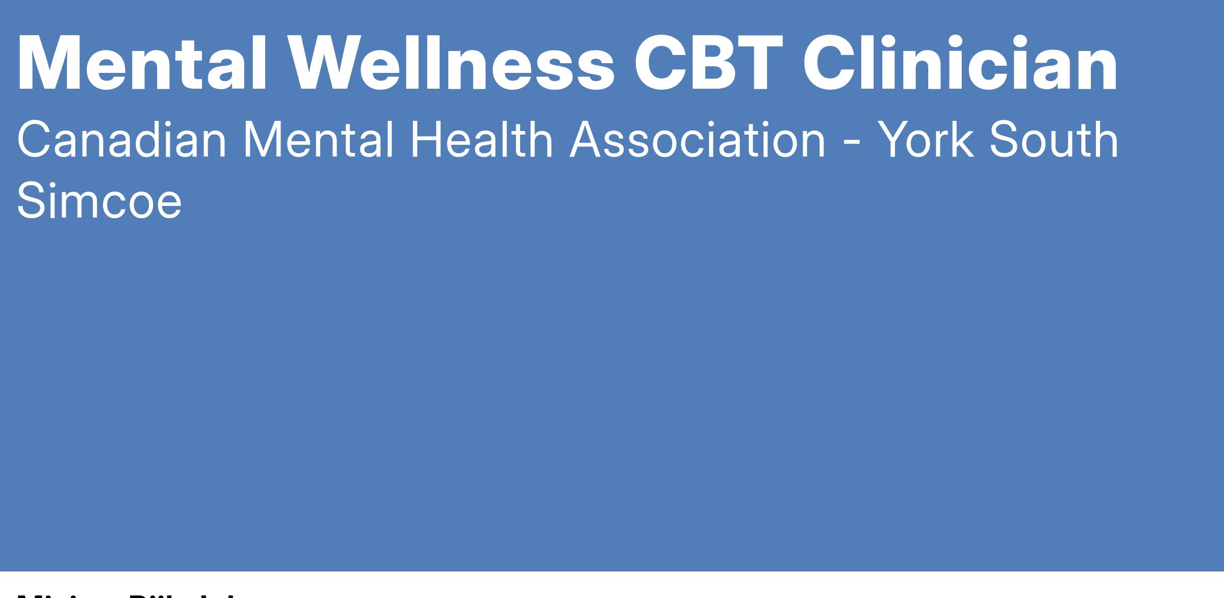 Application Procedure: If you are interested in this opportunity, please visit https://cmha-yr.on.ca/careers/ and search for Mental Health Wellness CBT Clinician, click on the “Apply Now” button, and proceed to upload your cover letter and resume.